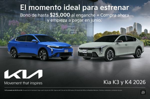 Aprovecha el momento ideal para estrenar los sedanes más innovadores de Kia. Adquiere tu Kia K3 o K4 2026 con un bono de hasta $25,000 aplicado directamente a tu enganche y la facilidad de comprar ahora con pagos hasta junio. Diseño moderno, seguridad líder en su clase y tecnología que inspira movimiento.