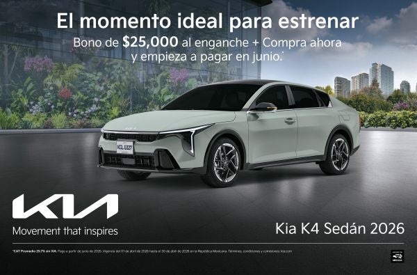 Aprovecha el momento ideal para estrenar el Kia K4 Sedán 2026, un vehículo que combina diseño sofisticado, tecnología avanzada y un rendimiento eficiente. Recibe un bono de $25,000 aplicado directamente a tu enganche y la facilidad de comprar ahora con pagos hasta junio. Elegancia, seguridad y el respaldo que inspira movimiento.